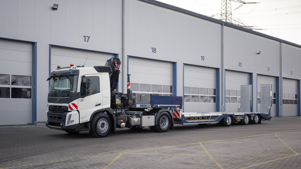 Auslieferung eines Sattelzuges mit Tieflader und Ladekran